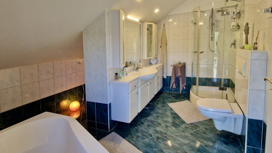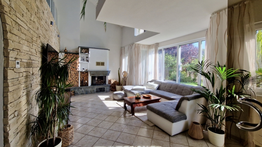 Gepflegtes, lichtdurchflutetes Einfamilienhaus in massiver Naturstein-Bauweise mit Klinkerfassade. Die Immobilie besticht durch einen großzügigen Wohn-Essbereich mit Kamin und Galerie sowie einen großen Südgarten mit Blick ins Grüne. Im Erdgeschoss finden sich zudem eine Wohnküche mit direktem Terrassenzugang und ein Gäste-Duschbad. Das Dachgeschoss bietet ein Master-Schlafzimmer mit Ankleide, ein großes Tageslichtbad und eine offene Galerie. Der voll ausgebaute Souterrain verfügt über Wohnraumhöhe und beherbergt einen Wellnessbereich mit Sauna sowie Hobby- und Vorratsräume. Modernisierungen wie die Gaszentralheizung (2015) und ein Smart-Home-System runden das Angebot ab.